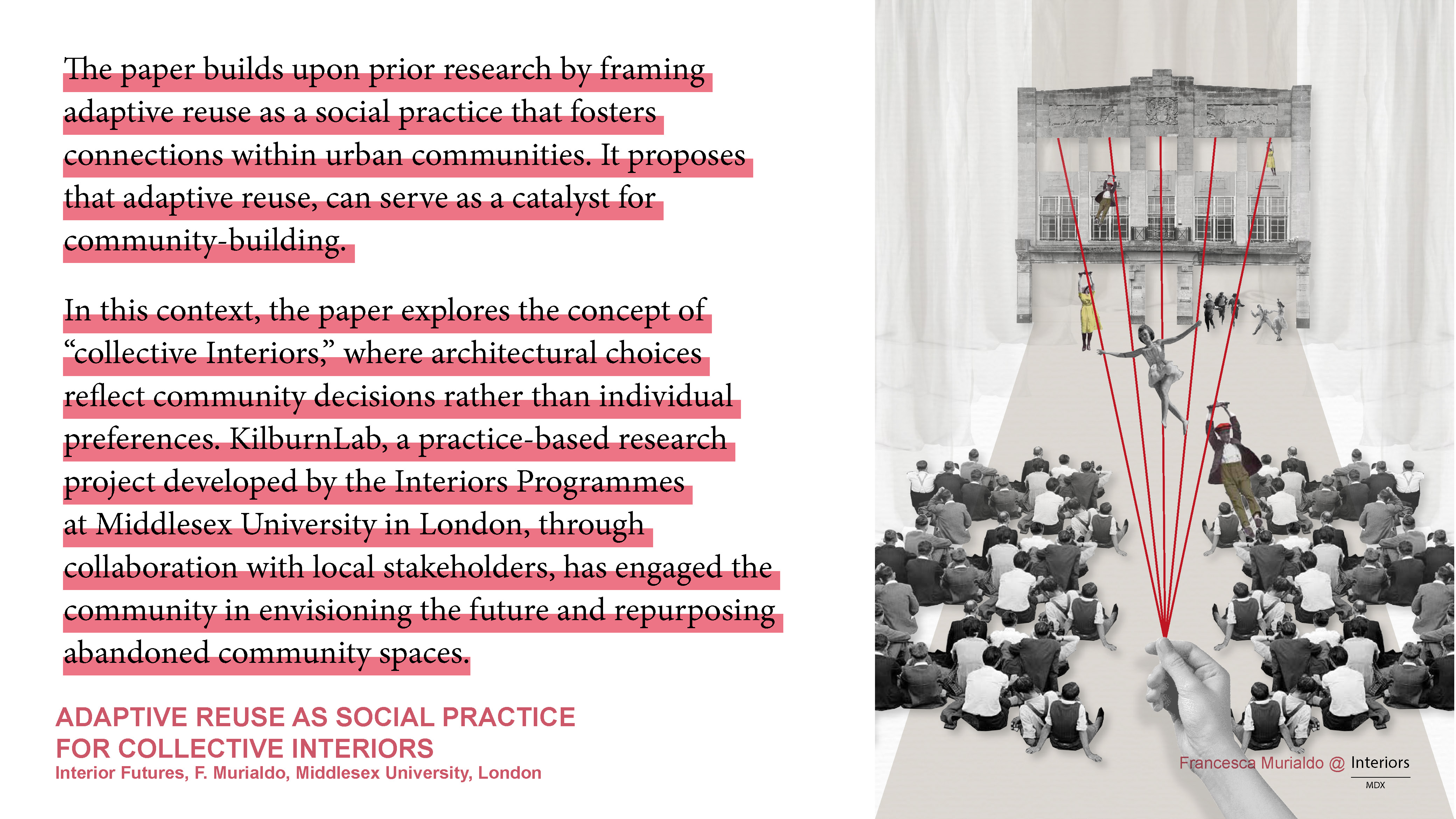 The concept of "collective Interiors" is introduced, advocating for ‘architectural’ decisions that mirror community choices over individual preferences. KilburnLab, an interdisciplinary research initiative by Middlesex University's Interiors Programmes in collaboration with local interested parties, exemplifies this approach. Through active participation, KilburnLab empowers communities to envision futures to repurpose neglected spaces.
